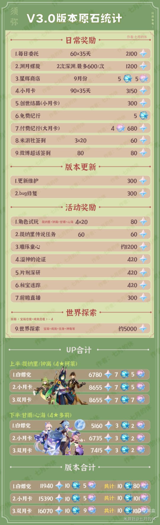 3、一共5个活动,地脉移涌没有原石,所以未计算原石,但一般这个活动在版本末尾,所以上下半卡池各取2.5个活动进行计算。