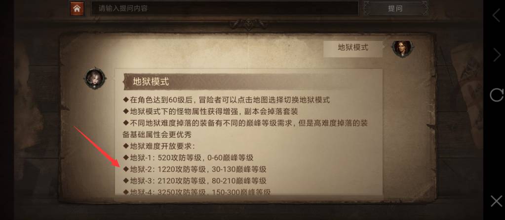 玩家通过提问界面可以知道,玩家在角色达到60级后,冒险者可以点击地图选择切换地狱模式,而地狱2需要1220攻防等级和30-130巅峰等级。