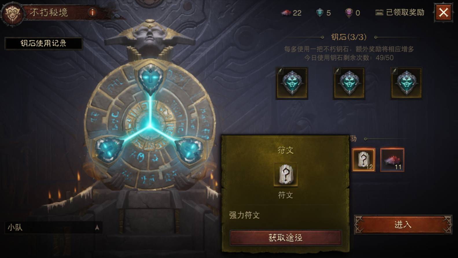使用不朽钥石通关不朽秘境可以获得随机数量的符文。
