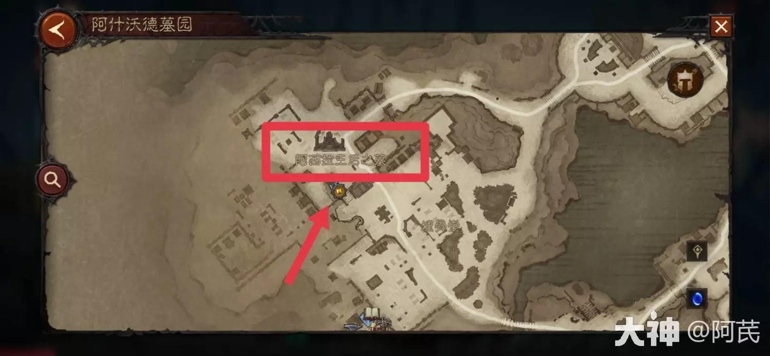 1.在地图阿西拉王后之墓所示位置,找到npc马力克