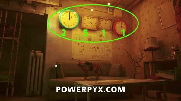 墙上挂着4个钟表,时针所指的位置就是密码,连起来即可得到开门密码2511