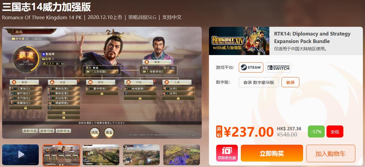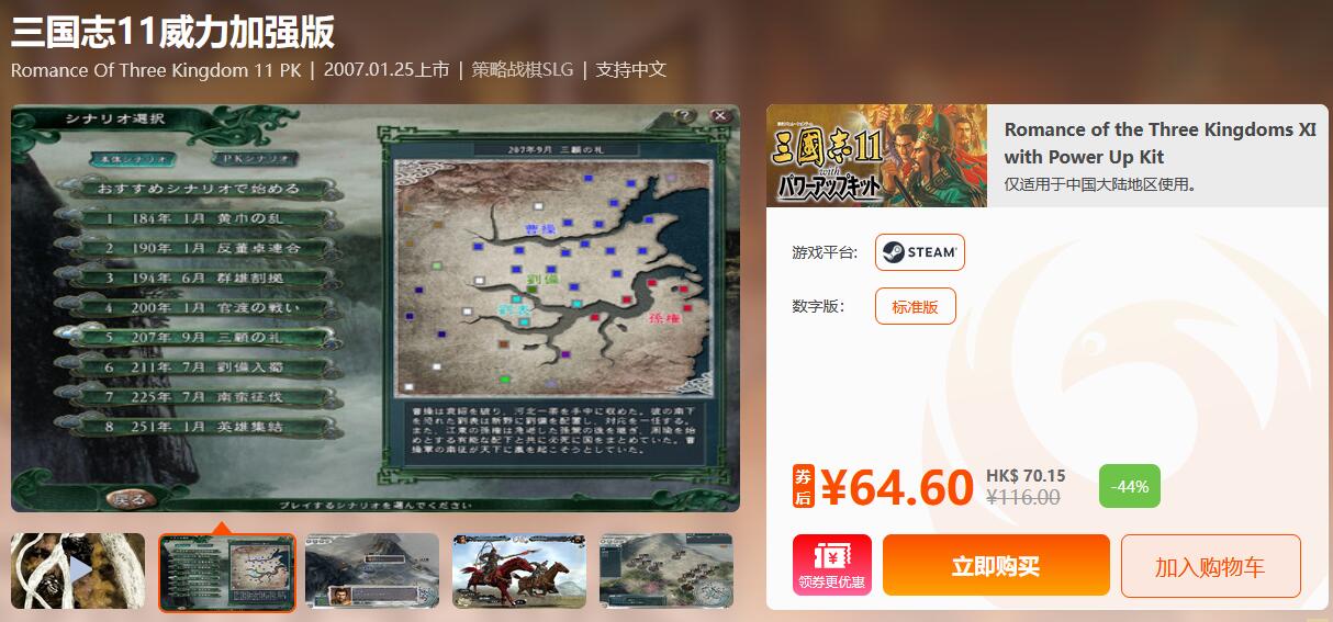 《三国志13威力加强版》闪促价:175元;steam史低:196元。