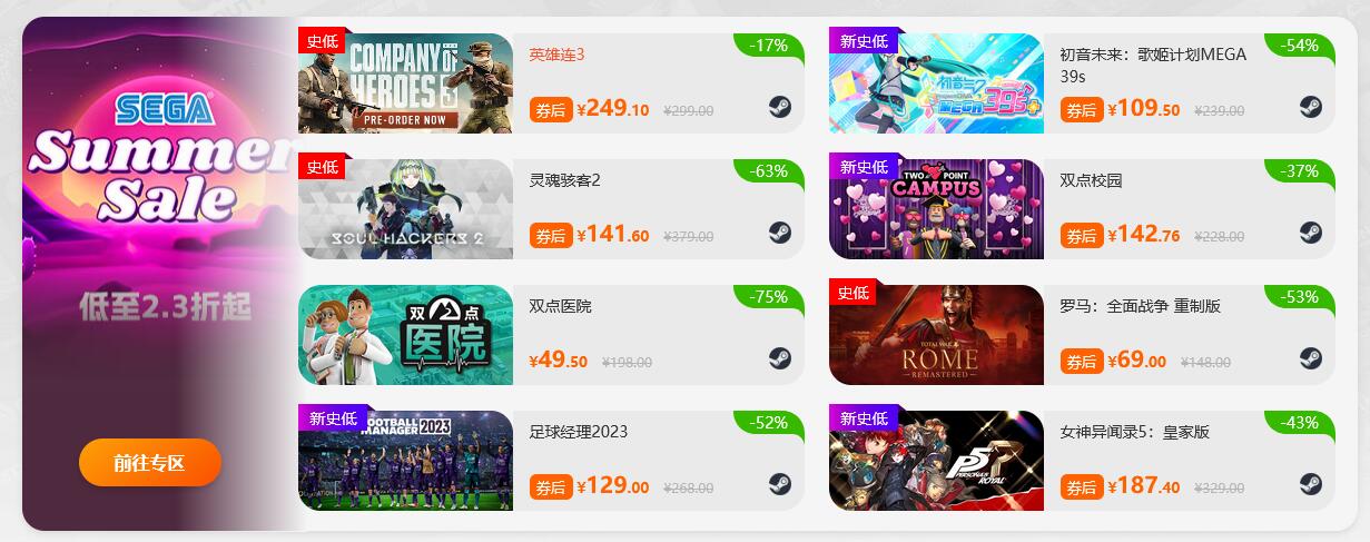 《女神异闻录5:皇家版》新史低187.4元,《双点医院》折扣价49.5元,《灵魂骇客2》史低141.6元等更多游戏打折促销中。