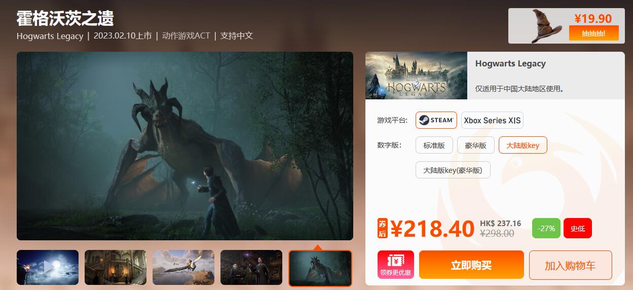 游戏券后仅需:218.4元;一款基于《哈利·波特》系列书籍设定的开放世界动作角色扮演游戏。