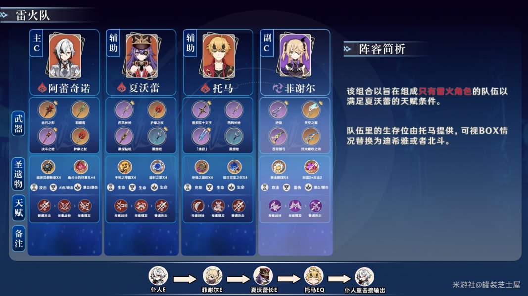 当然,上述条件必须得在雷火队的情况下才能满足,也就是夏沃蕾的天赋1,所以配队上除去仆人和夏沃蕾,可以带迪希雅或者托马,第四个角色优先推荐皇女,其次雷神、神子也可以带。