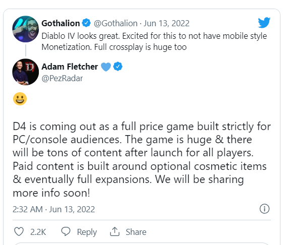 在备受玩家期待的同时,也有玩家担心《暗黑破坏神4》的收费模式会过于“手游化”,对此,全球社区负责人Adam Fletcher回应称“付费点在于可选的外观妆容和扩展内容,我们将很快分享更多消息!”这听上去有些类似《命运2》的模式,我们还需等待更多官方消息