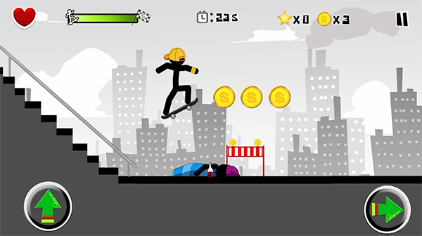 进入竞技场,成为一个火柴人滑板。你必须沿着城市骑行