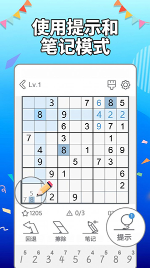 并且,它还有各种各样的辅助功能来帮助你完成数独,例如提示、撤销或者重做,记笔记等